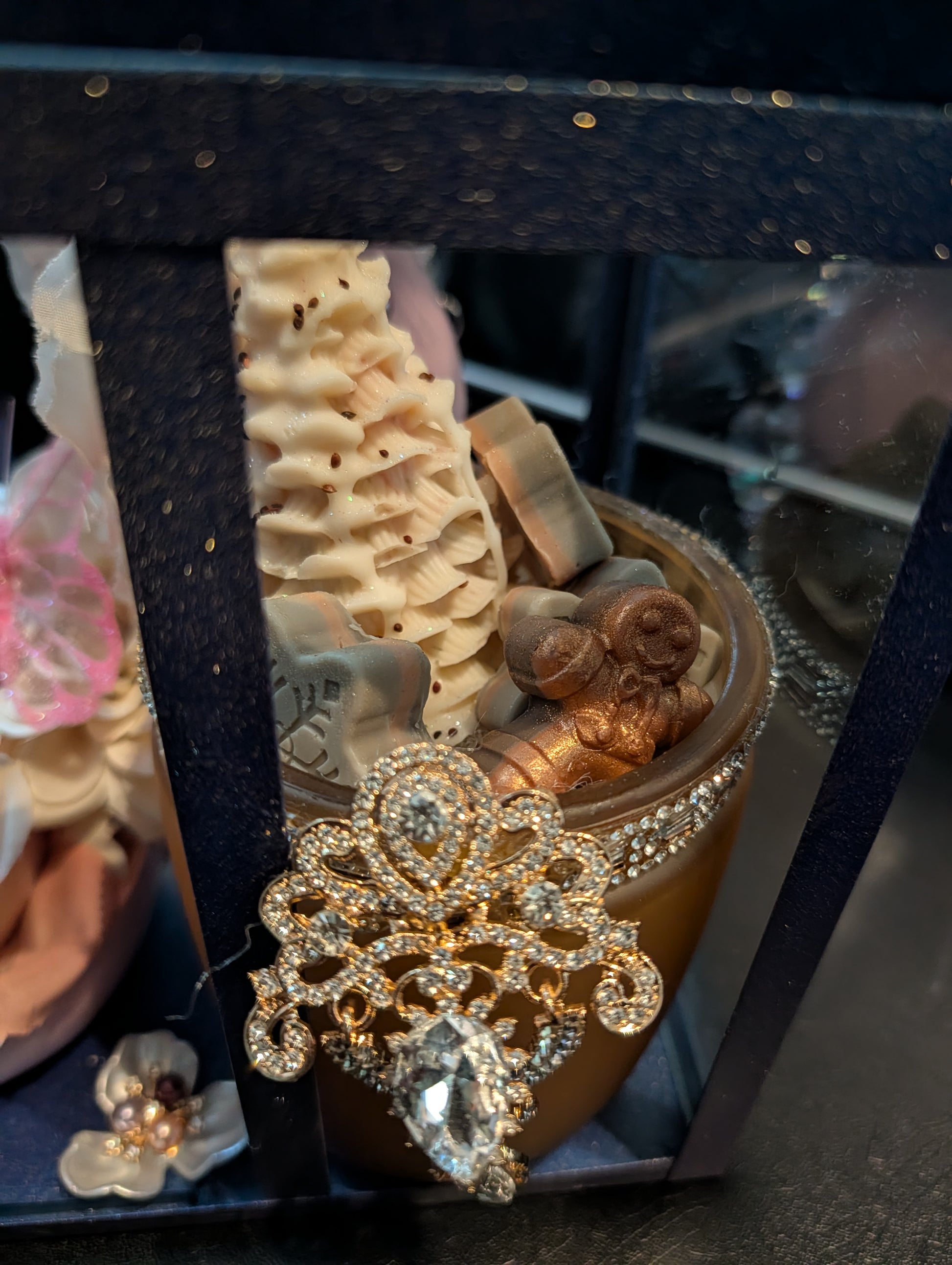 “This peacock color-toned cage transforms everyday items into a luxury display. Featuring a striking pink heel and a festive Christmas soap jar, it blends bold color with seasonal elegance—perfect for gifting or décor.”